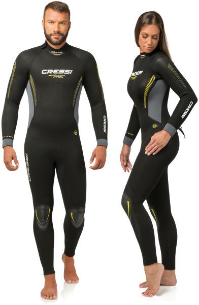 Cressi Fast 5 mm   Stylish, warm and versatile, the FAST  can be used in the widest range of temperate and cold waters.   Durable 5 mm, double-lined neoprene,  stands up well to compression at depth for maximum heat retention. Pre-shaped legs  improve flexibility for easier kicking. Modular system. Single piece of 3, 5 or 7 mm depending on the version + 5 mm hood + 3.5 mm shorty jacket with non-through stitching. All the pieces are available separately. This system allows the use of FAST in very different conditions, shorty and easy to place in summer, and an option with the suit in winter. Neck with anatomic design, preformed at 120 ° in the neck area for maximum comfort. The closure of the wetsuit presents a noticeable improvement  of the design that reduces the entry of water at this critical point. The closure flap is now much wider and the nape area is prolonged to prevent infiltration when the neck is tilted underwater. YKK back zip  with under zip lining and water-stop system. Anti-abrasion reinforcement on the knees. Knee and shoulder area with Tatex® anti-wear elastic reinforcements.   This type of reinforcement does not limit the elasticity of the neoprene, provides sufficient reinforcement and facilitates the positioning of the suit. Size from S/2 to XXXL/7